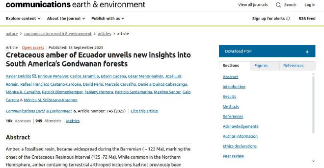 - El artículo Cretaceous amber of Ecuador unveils new insights into South America’s Gondwanan forests (El ámbar cretácico de Ecuador revela nuevos conocimientos sobre los bosques gondwananos de América del Sur) fue publicado en la revista Communications Earth & Environment.