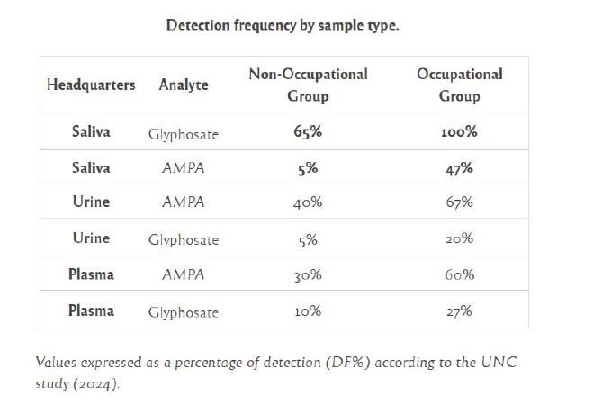 The average concentrations of glyphosate found in saliva were 2.86 ng/ml (nanograms per milliliter) in workers, compared to 0.38 ng/ml in the group without direct exposure. To ensure accuracy, highly complex technology such as gas chromatography coupled with mass spectrometry was used.