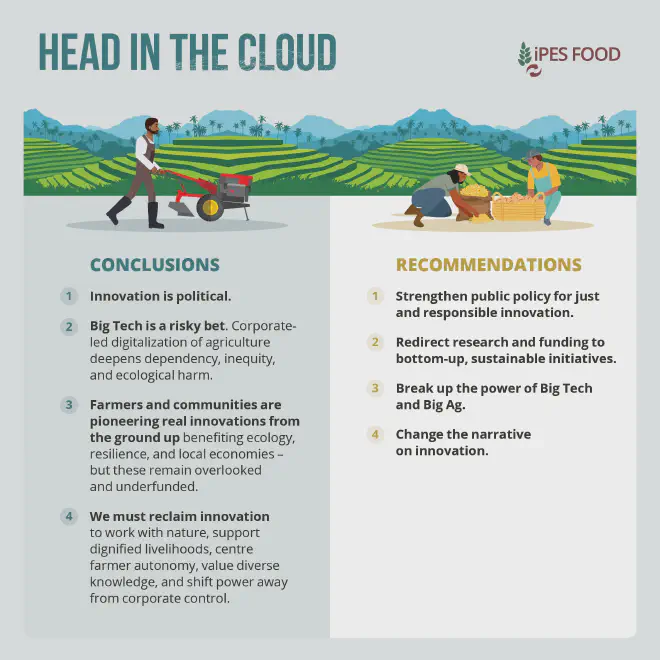 IPES-Food says that **“far from empowering farmers or tackling climate change, this rapid digital expansion risks increasing farmer debt and accelerating farm loss, deepening ecological harm, and concentrating corporate control over food production. Today IPES-Food published a newest report “Head in the Cloud - Challenging the false promise of digital agriculture and cultivating innovation from the ground up”, that we share here.